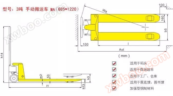Χαρακτηριστικά χειροκίνητου υδραυλικού φορτηγού WA 3 τόνων: ■ 3000KG υψηλή φορτία· • Νέα πλήρως κλειστή αντλία πετρελαίου, ασφαλής και αξιόπιστη, εύκ