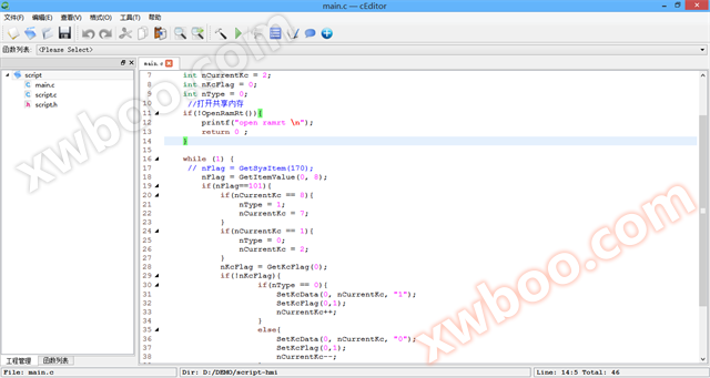 Το περιβάλλον προγραμματισμού της γλώσσας C, όπως φαίνεται παρακάτω, επιτρέπει στους χρήστες να ενσωματώσουν τη δική τους γλώσσα C ή να την αναπτύξουν μόνοι τους, καλώντας δεδομένα μνήμης QTouch ή δεδομένα SQL μέσω του API.